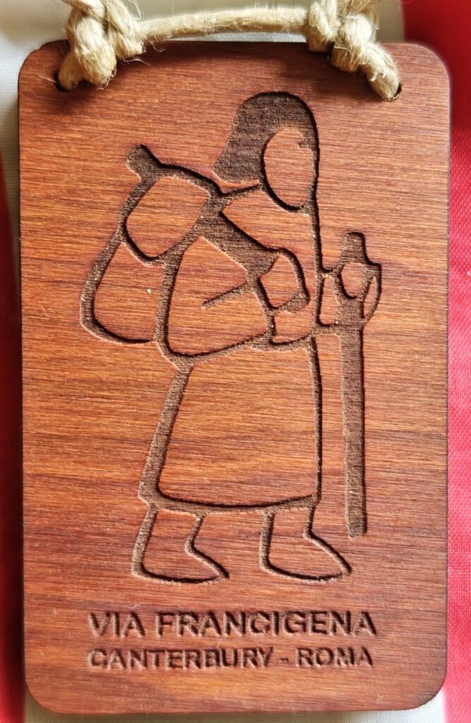 Das Zeichen der Via Francigena ist dieser stilisierte Pilger, den auch ich auf meinem Rucksack trage.