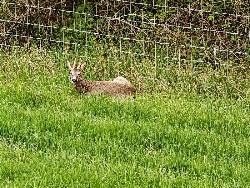 Von Trebur geht es in Richtung Rhein. Die Ruhe der Landschaft wird heute nur durch die Flugzeuge gestört. Der Rehbock lässt sich nur durch unser Vorbeigehen kurz beim Wiederkäuen aus der Ruhe bringen.