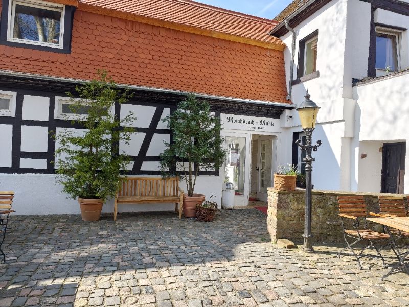 Gleich gegenüber dem Schloss steht die alte Mönchbruchmühle, die von 1708 bis ca.1910 in Betrieb war. Danach wurde sie eine beliebte Gaststätte.