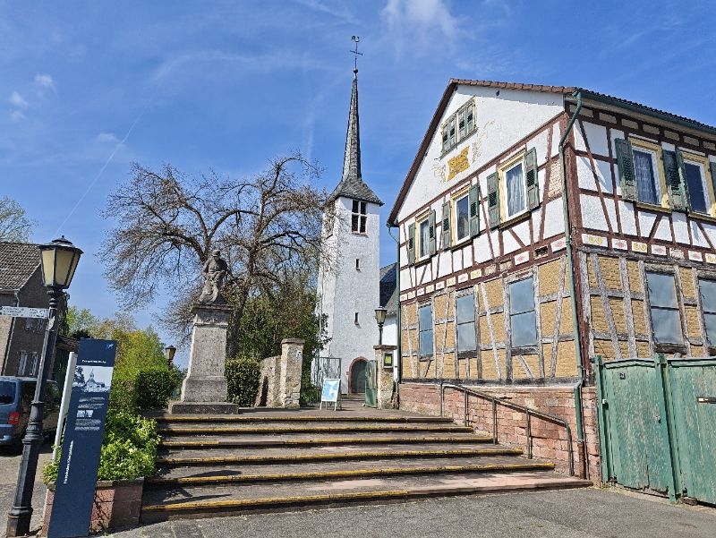 Die evangelische Kirche geht auf einen karolingischen Vorgängerbau (um 1200) zurück, der 1944 einem Bombenangriff zum Opfer fiel und nach dem alten Vorbild wieder errichtet wurde.