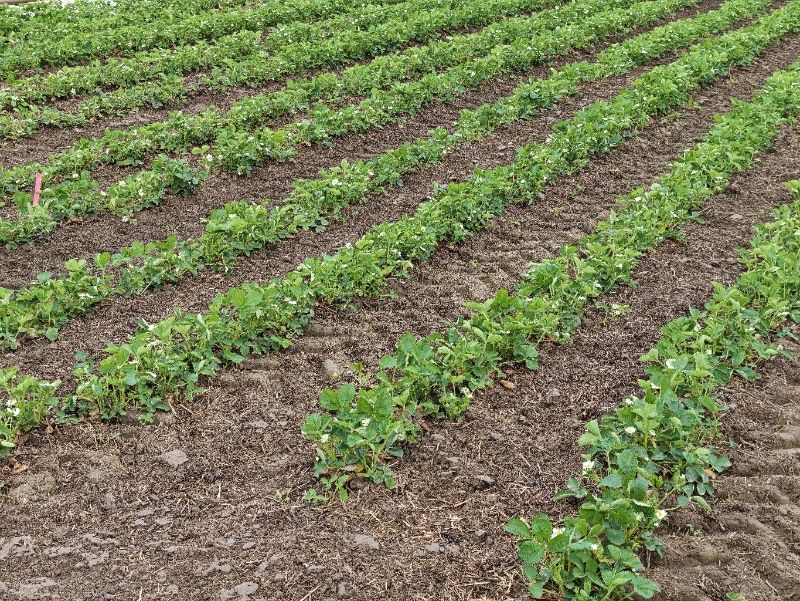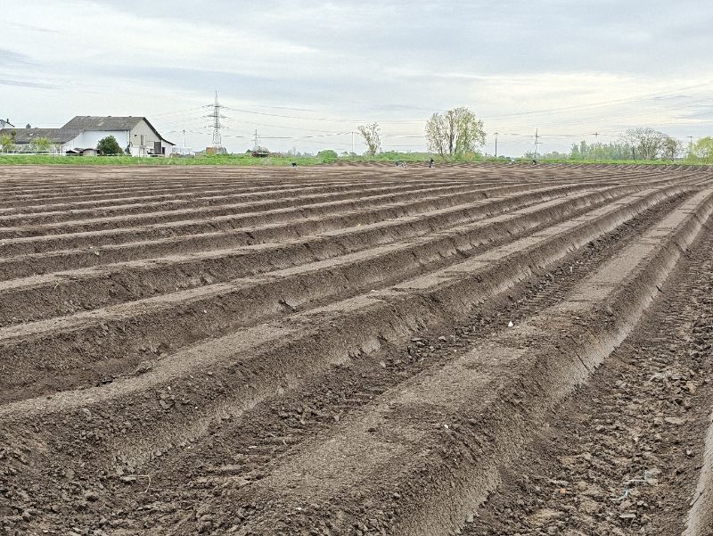 Zu unserer Überraschung kommen wir an Erdbeerfeldern vorbei, für in Vollblüte stehen, obwohl sie nicht im Tunnel stehen. Auch Freilandspargel wird schon geerntet.