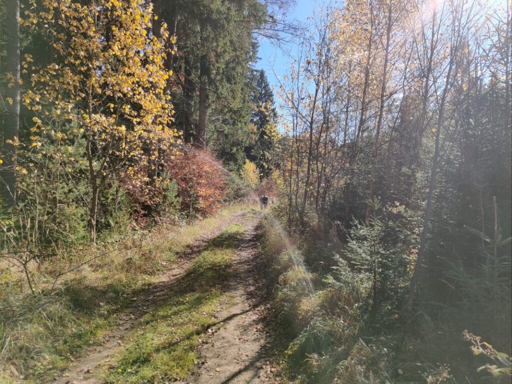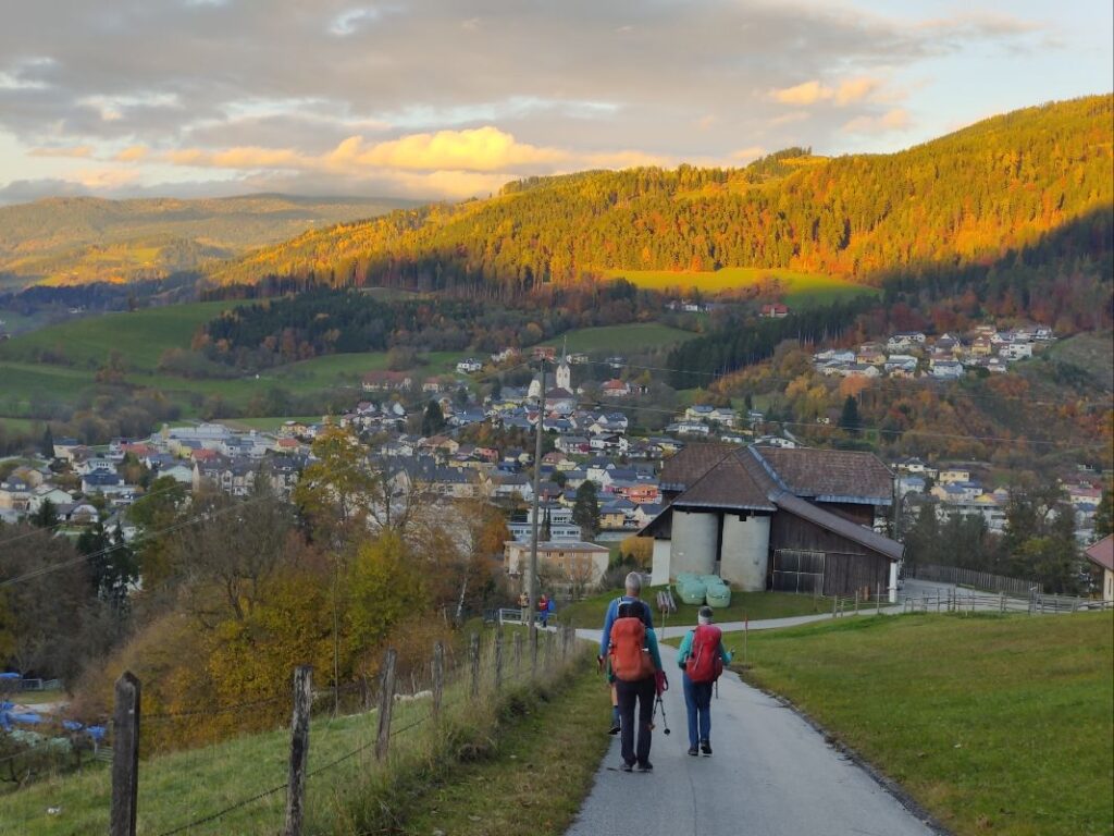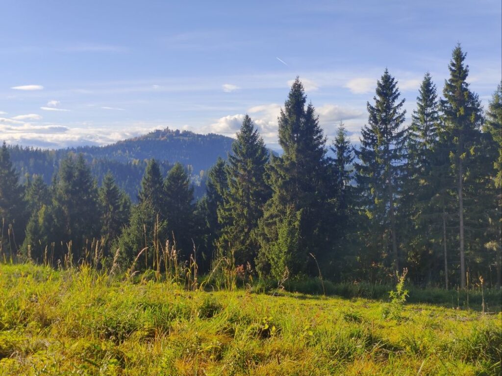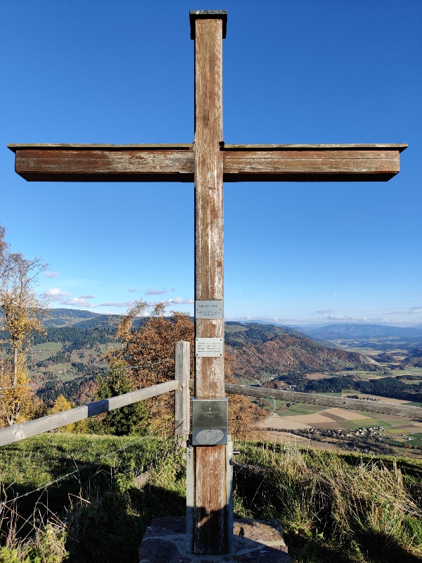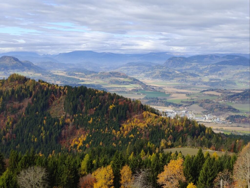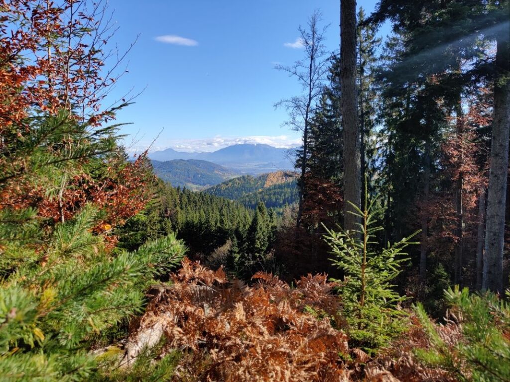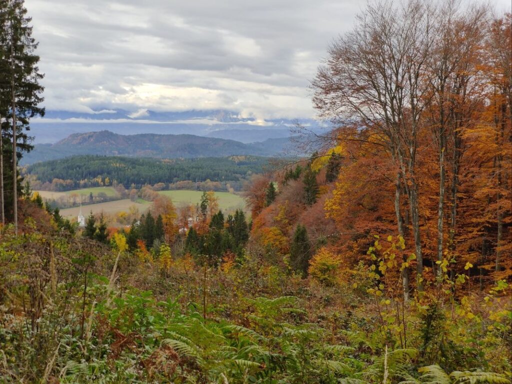 Gleich nach dem Abstieg nach Göriach geht es durch den Herbstwald auf den Christofberg auf fast 1000 m Seehöhe. Am 4. Juni 1919 kam es im Vorfeld des Kärntner Abwehrkampfes auf den Höhenlinien des Christofberges zur Besetzung durch jugoslawische Truppen und Vertreibung der ortsansässigen Bevölkerung.