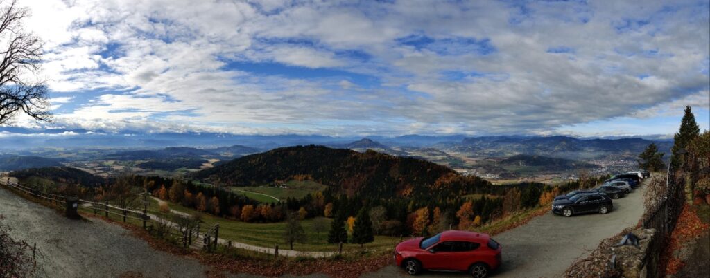Von der Terrasse des Restaurants haben wir einen Fernblick über die Karawanken und die Hohen Tauern.