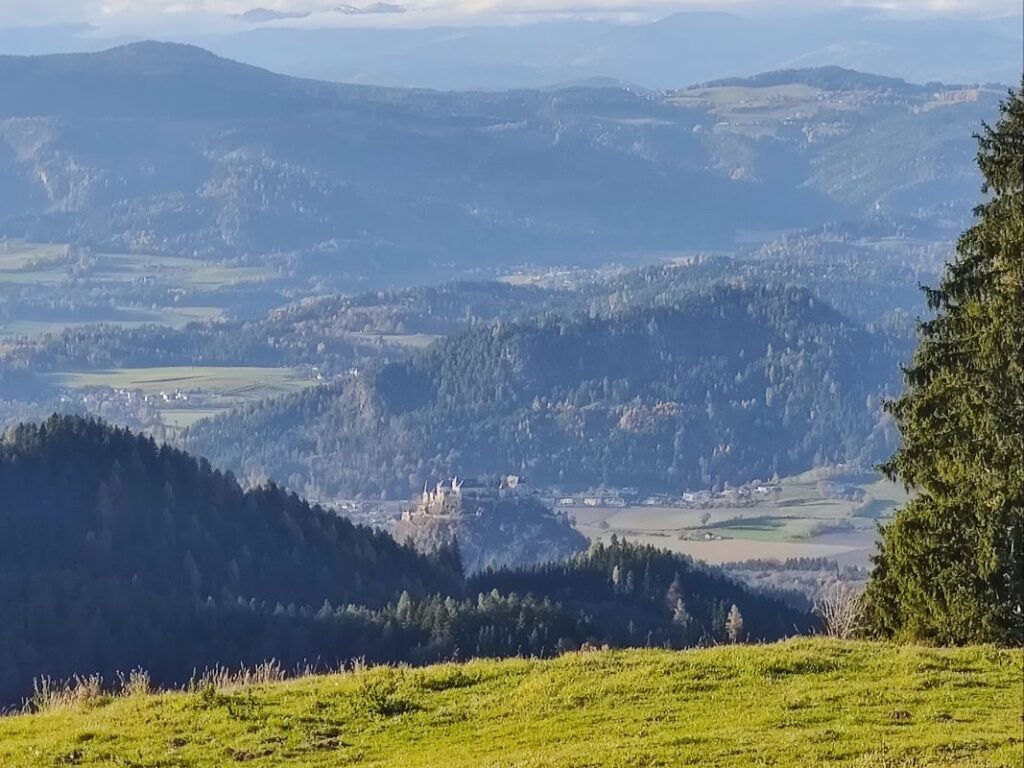 Auf der Westseite des Lippekogels können wir im Tal die Burg Hochosterwitz erkennen.