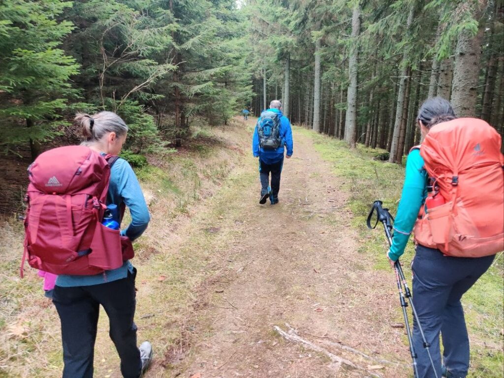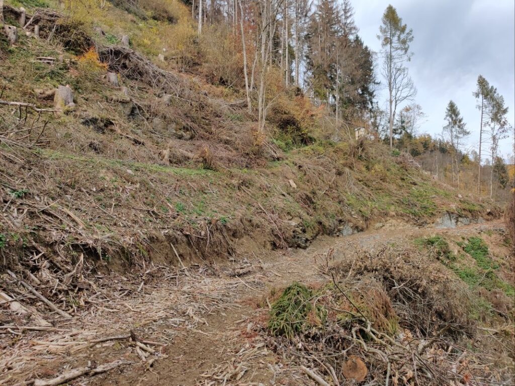 Kurz stellt sich uns ein Hindernis in den Weg. Wegen Forstarbeiten nach einem Windbruch war der Weg vor einiger Zeit gesperrt und Wanderer mussten einen großen Umweg gehen. Jetzt ist die Tafel weg, aber der Originalweg ist ist eher beschwerlich zu gehen. Wir nehmen kurzerhand den neu eingerichteten Holzbringungsweg und sind bald wieder auf einem gut begehbaren Weg.