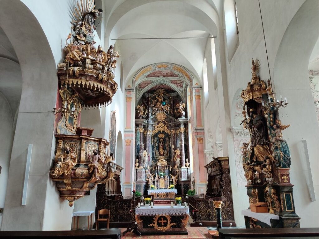 Die spätromanische dreischiffige Pfeilerbasilika lag ursprünglich außerhalb der ehemaligen wehrhaften Kirchhofmauer.