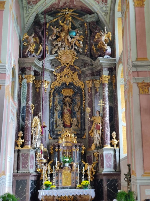 Die spätromanische dreischiffige Pfeilerbasilika lag ursprünglich außerhalb der ehemaligen wehrhaften Kirchhofmauer. 1272 wurden das Kloster und die neue Stiftskirche Maria in Haslach (Maria Himmelfahrt) fertiggestellt