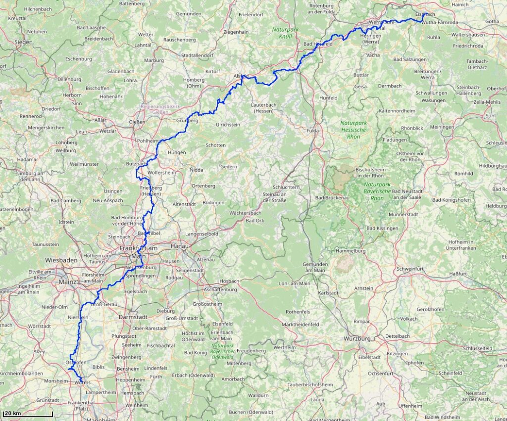 Die Strecke führt von Eisenach im Thürringen, quer durch Hessen nach Worms in Rheinland-Pfalz.