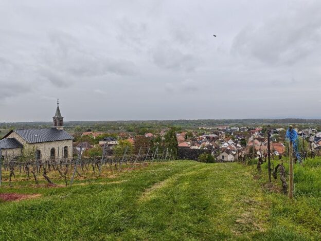 Nach Guntersblum steigen wir wieder die Weinberge hinauf und kommen in Hängen-Wahlheim bei der Ruine der Kirche St. Magdalena und St. Jakobus vorbei. Das spätgotische Kirchlein wurde wahrscheinlich im 17. Jhdt. zerstört und jetzt durch eine Privatinitiative wieder aus dem Dornröschenschlaf erweckt.